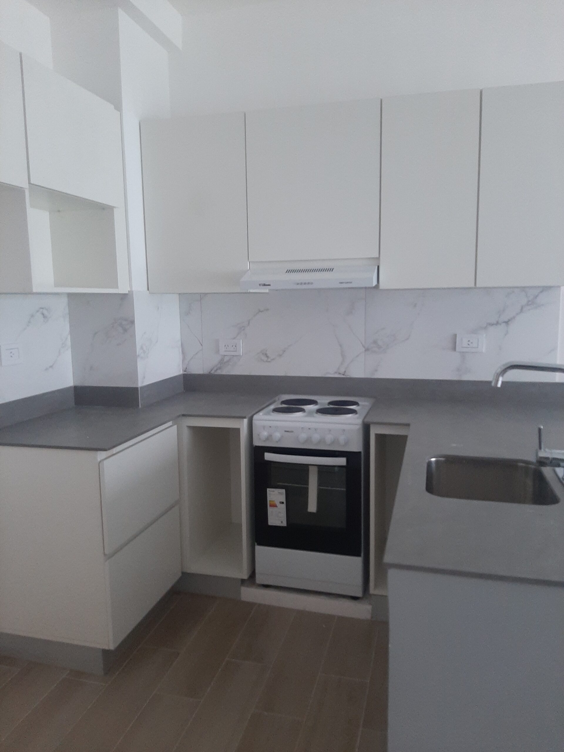 - Amoblamientos de cocina en melamina color blanco y placares en color gris claro semi mate con interiores terminados
